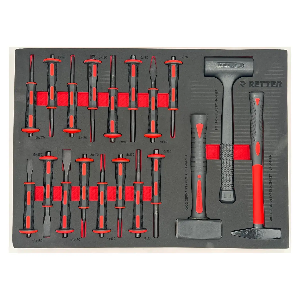 2 kom dlijeta, trokutasto dlijeto 6*10*180 mm, ravno dlijeto 19*12*180 mm 1 kom čekić za kamen: 1000 g 1 kom strojarski čekić: 400 g 1 kom profesionalni gumeni čekić s drvenom drškom: 400 g 1 kom kliješta s dugim vrhom (europska: 8 kom 1 kom kliješta sa zakrivljenim vrhom 8 kom 1 kom dijagonalna kliješta za rezanje s velikom glavom 7 kom kombinirana kliješta 7 kom kliješta za vodenu pumpu 10 kom kliješta sa zakrivljenom čeljušću: 10
