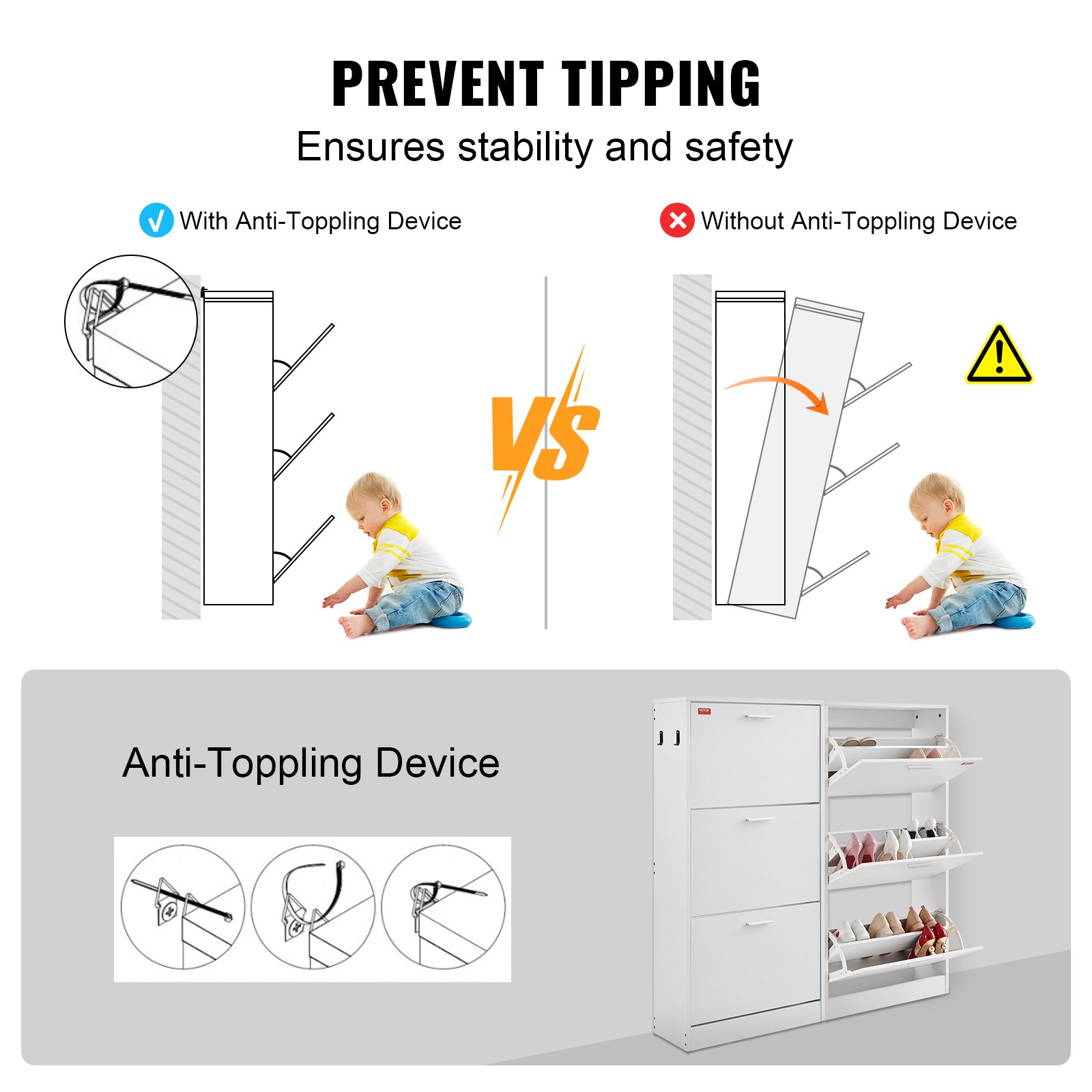 VEVOR Uski ormarić za cipele, Bijeli stalak za cipele, 600 x 237 x 1200 mm, Ormarić za cipele s 3 vrata + gornjim odjeljkom za pohranu, Komoda za cipele nosivosti 45,35 kg, Ormarić za cipele od punog drva za hodnik