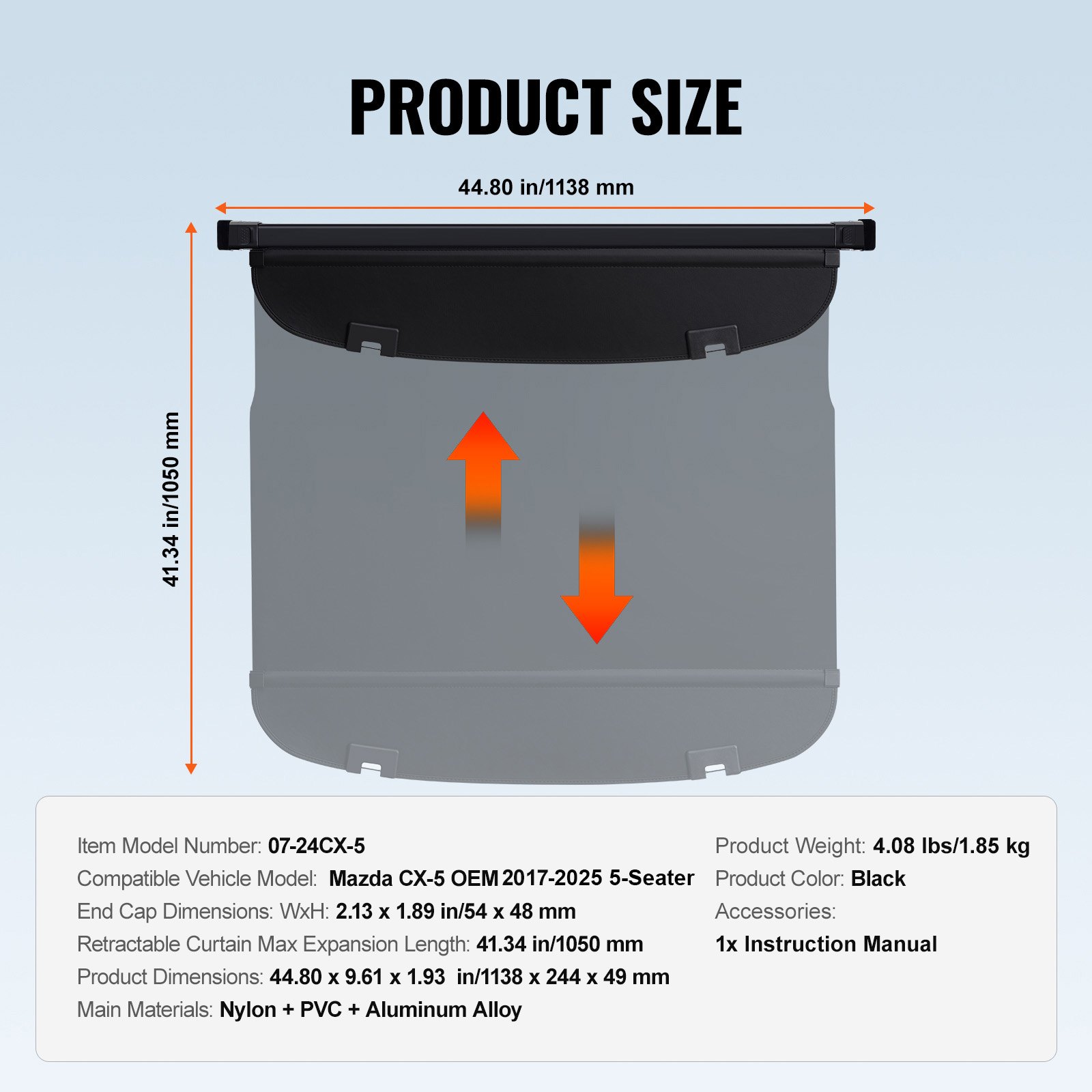 Dimenzije završnog poklopca: Š x V: 54 x 48 mm, Boja proizvoda: Crna, Kompatibilni model vozila: Mazda CX-5 OEM 2017–2025 5 sjedala, Glavni materijali: Najlon + PVC + aluminijska legura, Težina proizvoda: 1,85 kg, Dimenzije proizvoda: 1138 x 244 x 49 mm, Broj modela artikla: 07-24CX-5, Maksimalna duljina produžetka uvlačive zavjese: 1050 mm