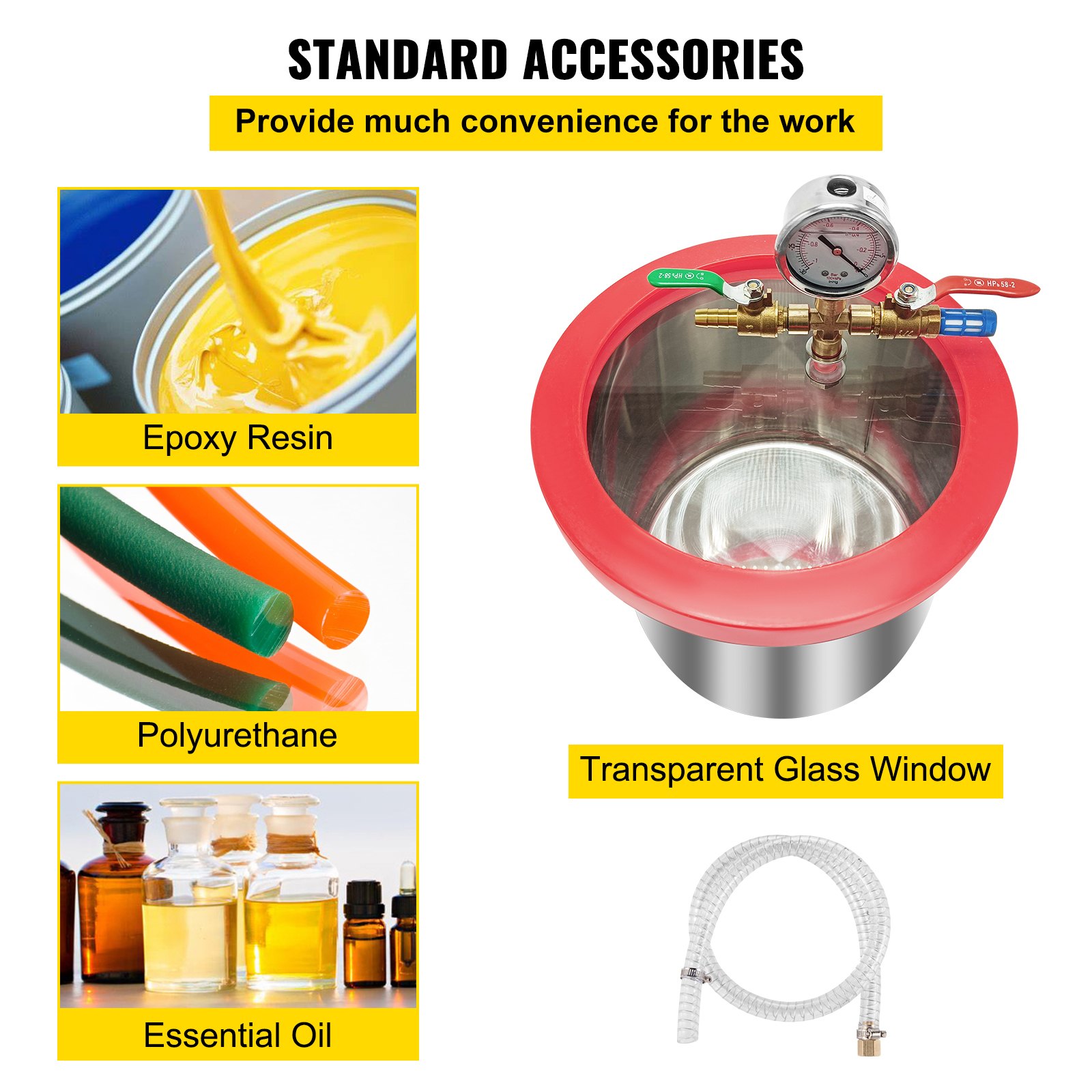 Brzina pumpe: 1720 o/min, Kapacitet ulja: 220 ml, Debljina poklopca: 3/5 inča, Napon: 220 V / 50 Hz, Materijal: Kućište od legure aluminija + bakar + nehrđajući čelik, Maks. radna temperatura: 71℃ (160 ºF), Kapacitet pumpanja: 3 CFM, Volumen: 1,5 galona, Krajnji vakuum: 5 Pa, Vakuumska komora: 22 x 18 cm (8,6 x 7,09 inča)