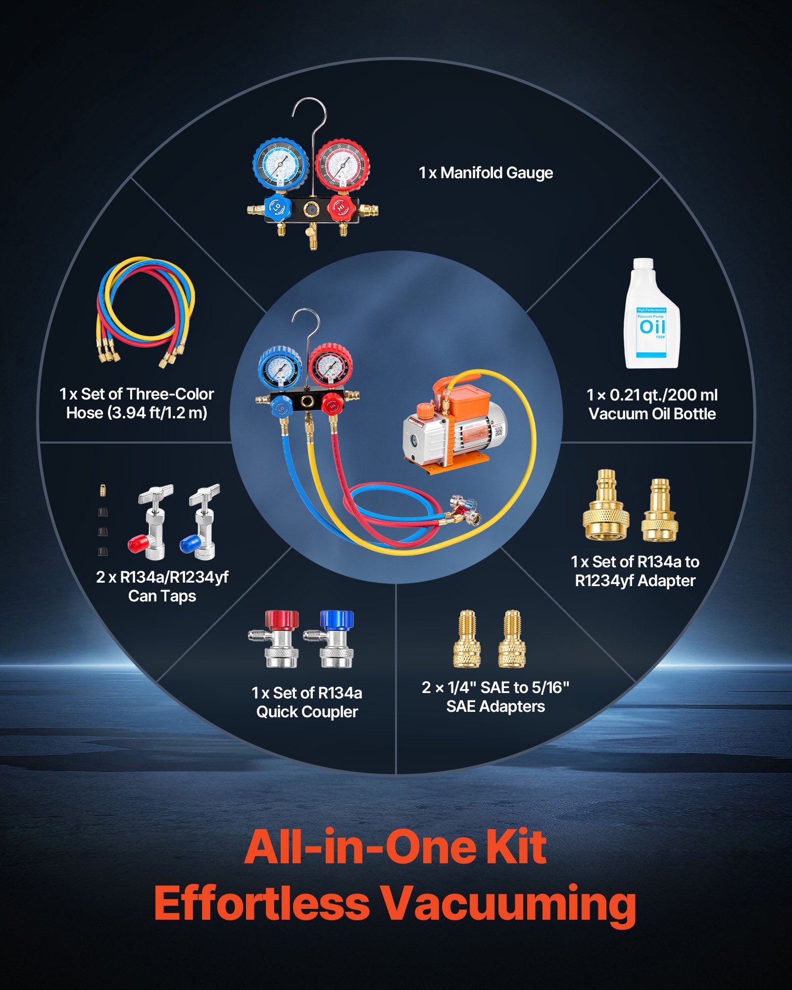 VEVOR vakuumska pumpa s manometrom, 3,5 CFM 99 L/min, 180 W 1-stupanjska rotacijska vakuumska pumpa s lopaticama, komplet vakuumske pumpe za R134a, R22, R410a, R1234YF i R32, s torbom za nošenje za automobilske klima uređaje