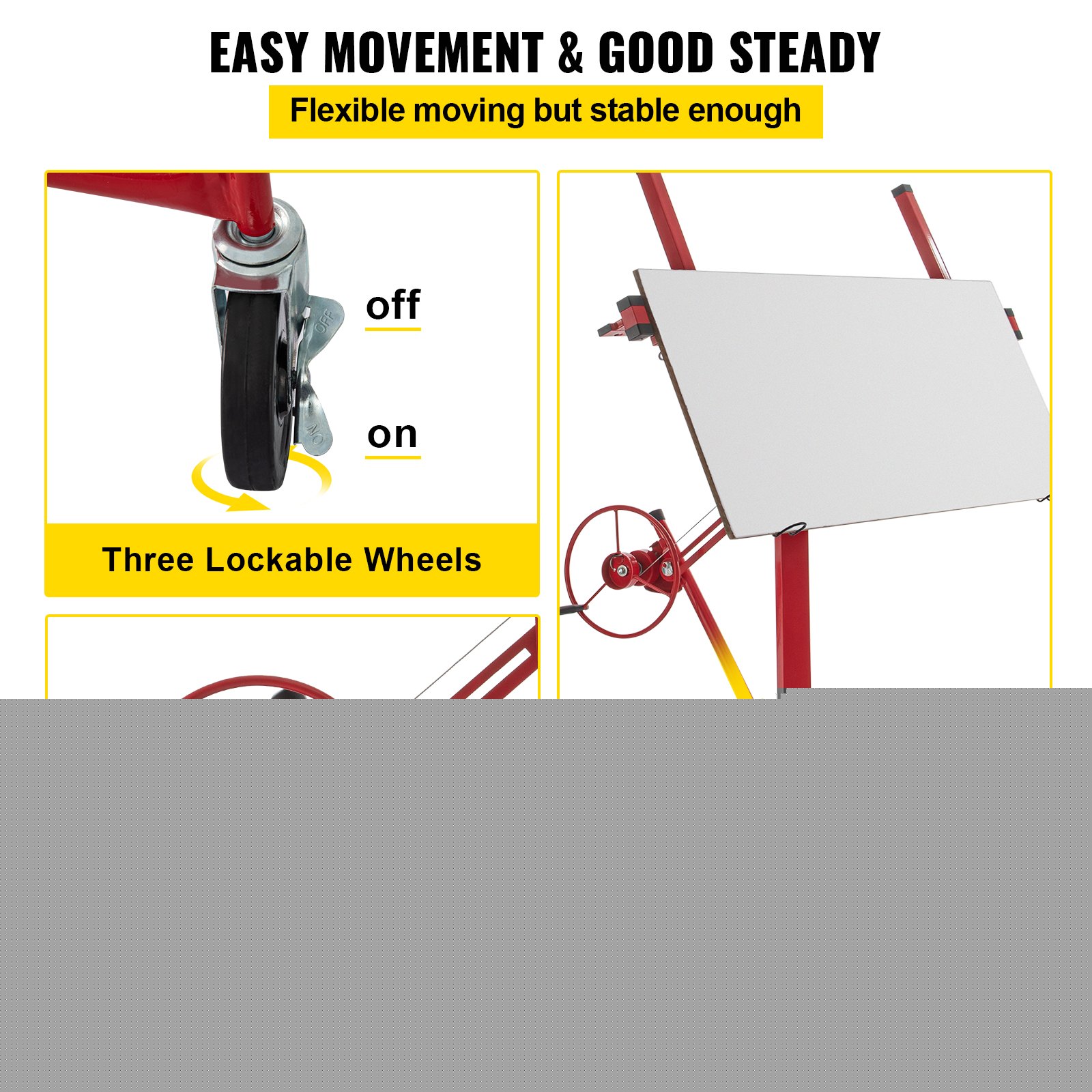 VEVOR Valjčani podizač za suhu gradnju, podizač panela, pomoć pri montaži gipsanih ploča, dasaka i plastičnih panela, rukovanje od strane 1 osobe, radna visina 120-335 cm, nosivost 68 kg, crvena. Robusna čelična konstrukcija. Proširivi okvir i ruka. Nagib 60 stupnjeva. Sigurno i stabilno. Tri kotača koja se mogu zaključati. Široka primjena. Boja: Crvena, Model: LG-021, Nosivost: 68 kg, Raspon visine: 120-335 cm, Materijal: Ugljični čelik, Raspon širine: 124-290 cm, Veličina gipsane ploče: 122-488 cm