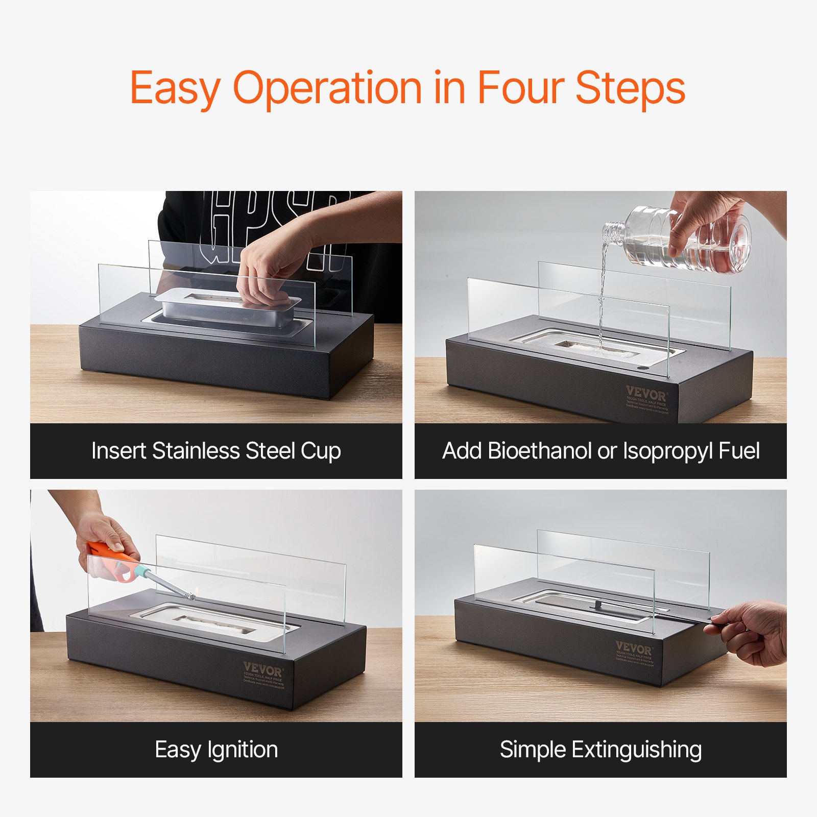 VEVOR Vatrena jama, 35x18x14cm Metalni stolni kamin, Uređenje za unutarnju i vanjsku upotrebu, Posuda za vatru za čišćenje alkohola, Aparat za S’mores sa staklom, za terasu i balkon s aparatom za gašenje požara, kvadratna
