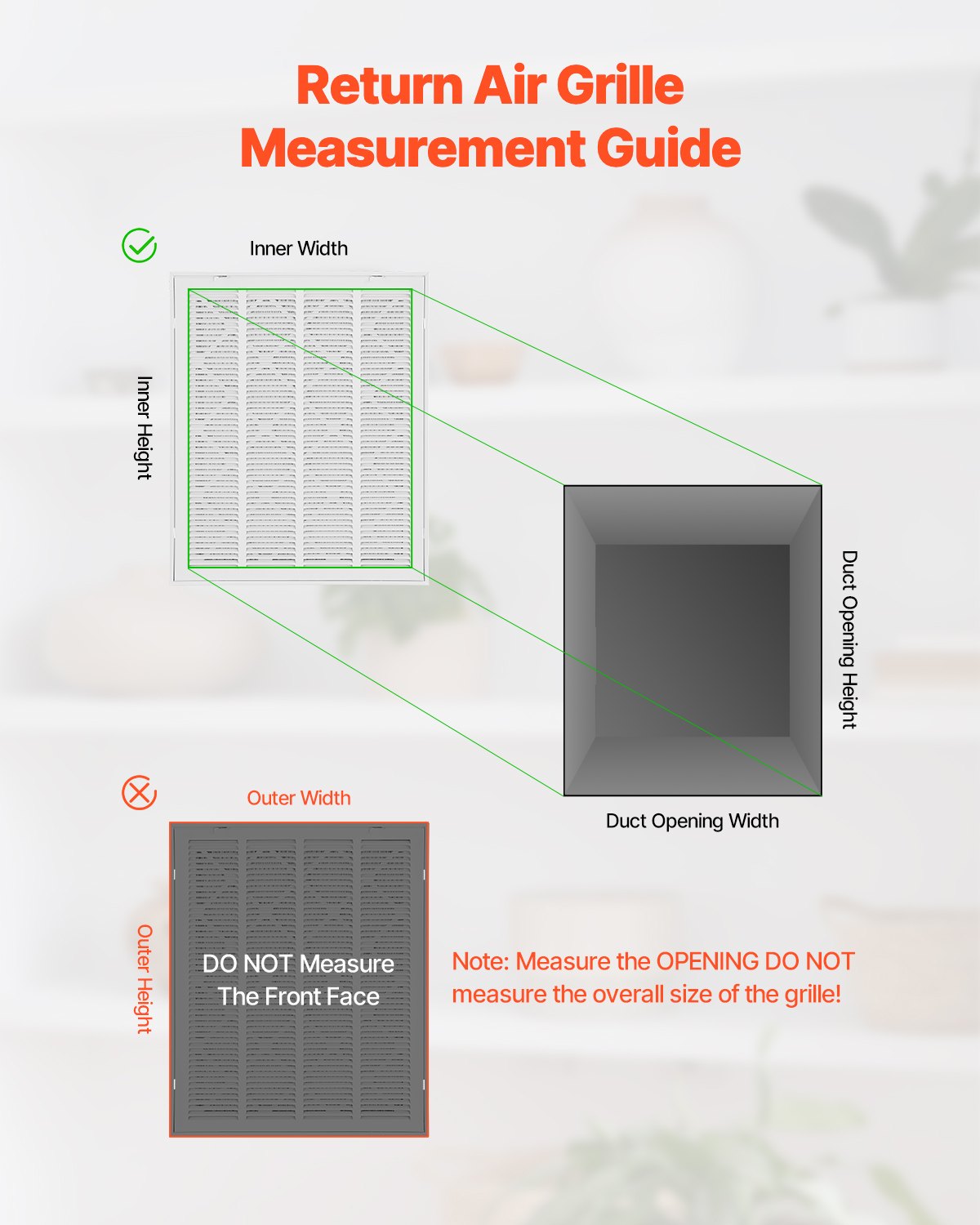 VEVOR Ventilacijska rešetka 57,4 x 70,2 x 4 cm, odgovara otvoru za ugradnju 50 x 63 cm (Š x V), filter uključen, zidna ispušna rešetka, rešetka s čeličnim žaluzinama, rešetka filtera za povratni zrak, Kako mjeriti, Učinkovita izmjena zraka, Jednostavna zamjena i održavanje, Jednostavna ugradnja, Više opcija veličina, Debljina otvora za ugradnju: 2,7 cm, Dimenzije utora za filter: 49,8 x 62,8 x 3,2 cm, Neto težina: 3,5 kg, Broj modela artikla: 1RAF2025F-1, Dimenzije otvora za ugradnju: 50 x 63 cm, Dimenzije proizvoda: 57,4 x 70,2 x 4 cm, Ocjena filtera: MERV8