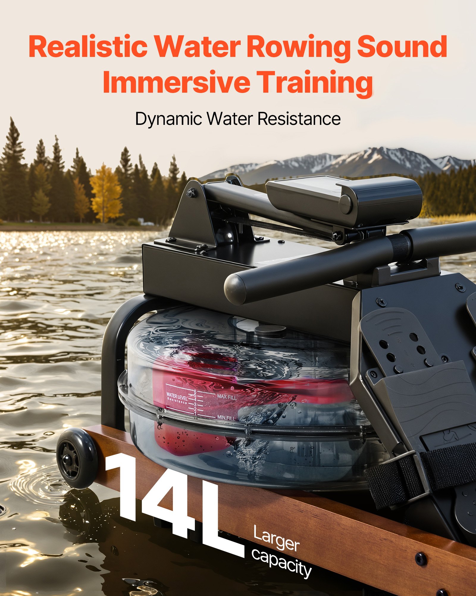 VEVOR veslački trenažer, tihi otpor sa 6 razina, sklopivi drveni veslački trenažer za vodu sa spremnikom za vodu od 14 l i LCD monitorom, kompatibilan s Bluetooth aplikacijom, nosivost 158 kg, impresivni veslački trenažer