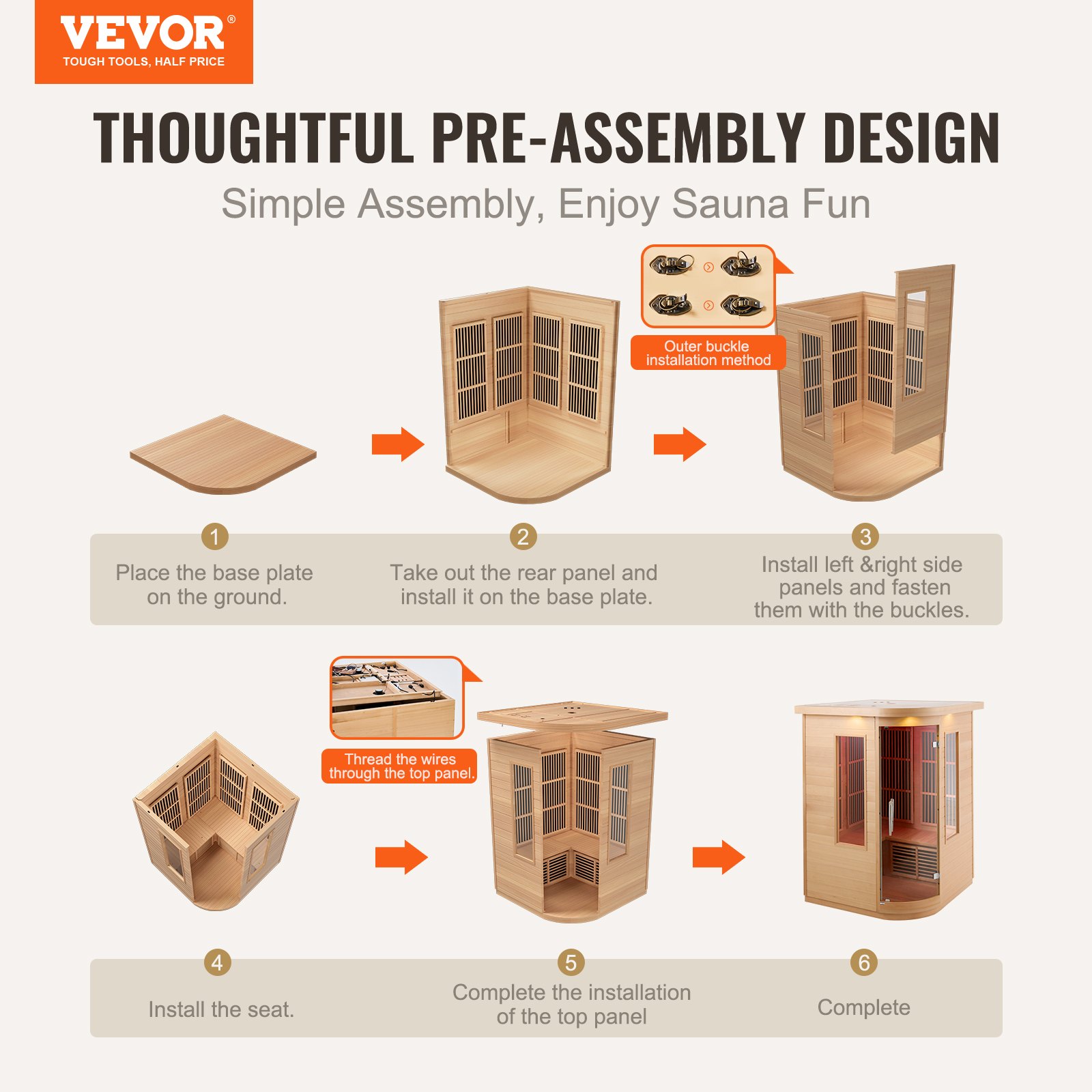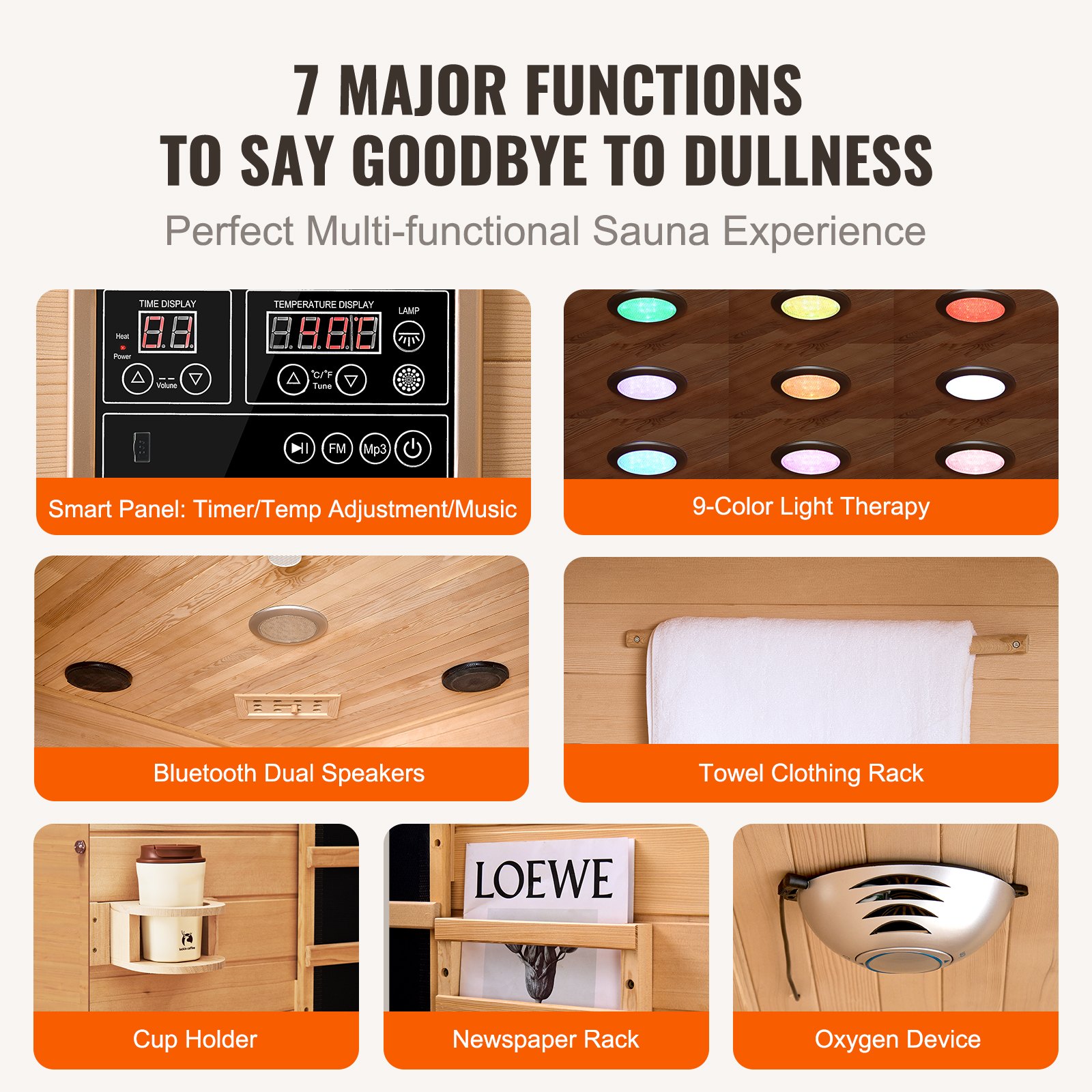 VEVOR Drvena infracrvena sauna, kućna sauna spa, za 2 osobe, niskoelektrična infracrvena sauna s vratima od kaljenog stakla, LED višebojnom lampom i Bluetooth zvučnicima, 2 kW za unutarnju upotrebu