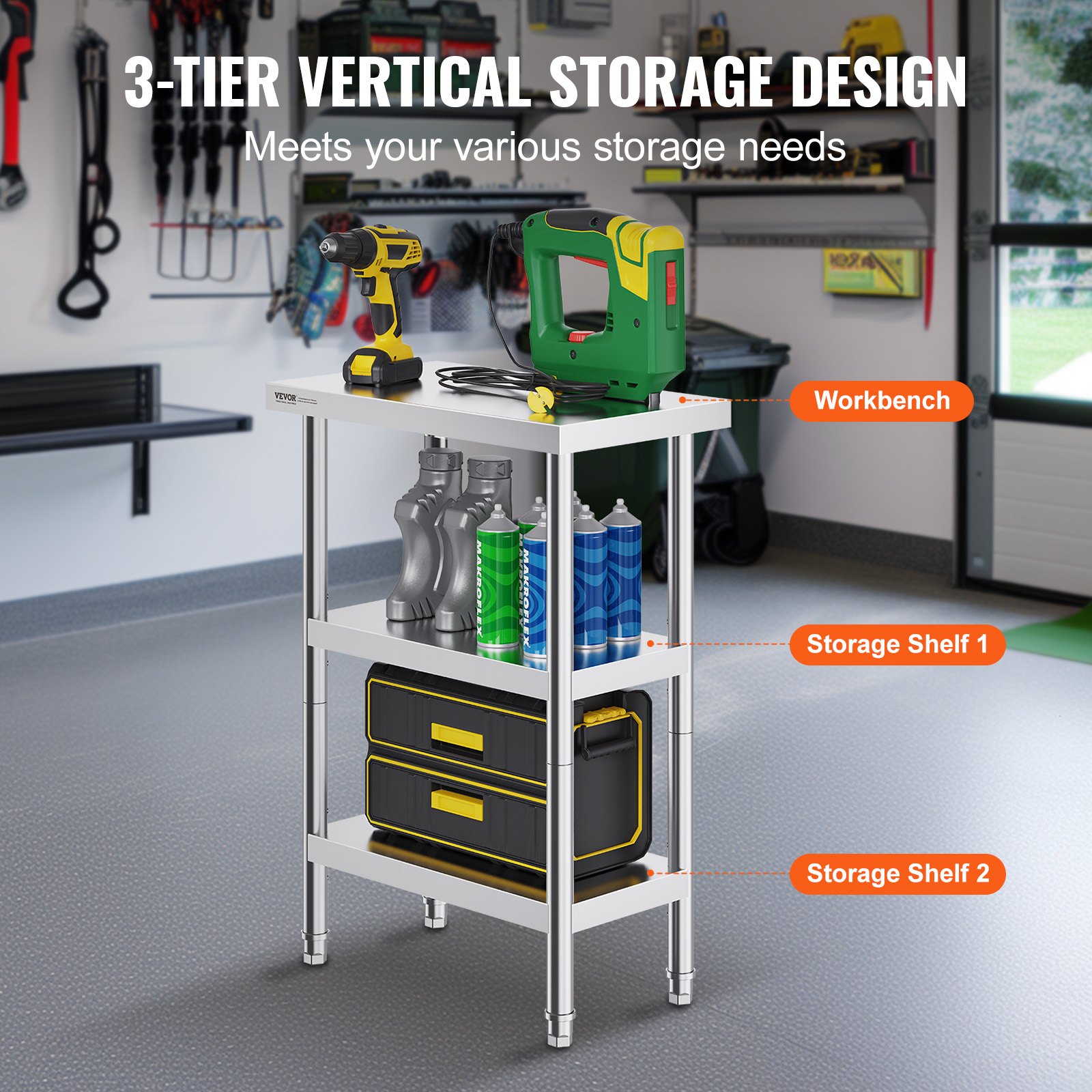 VEVOR Stol za pripremu hrane od nehrđajućeg čelika, Radni stol za komercijalne kuhinje, s 2 podesive donje police, 356 x 610 x 864 mm Metalni stol za pripremu roštilja, kuhinje, doma