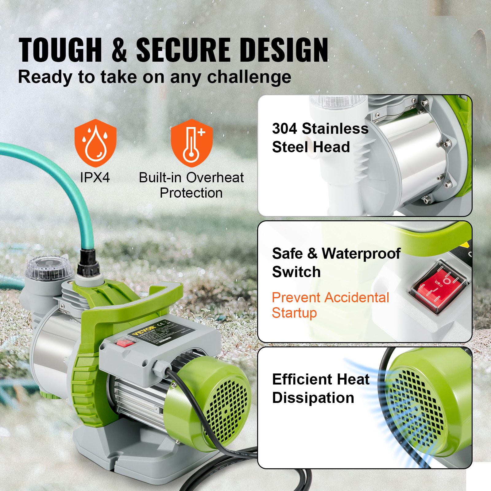 VEVOR vrtna pumpa 1100W pumpa za navodnjavanje Maks. protok 4560L/h Centrifugalna pumpa 4,5bar Maks. tlak Plitka bunarska pumpa Predfilterska pumpa za bazen Maks. visina isporuke 45m Prijenos vode za navodnjavanje Crpljenje vode