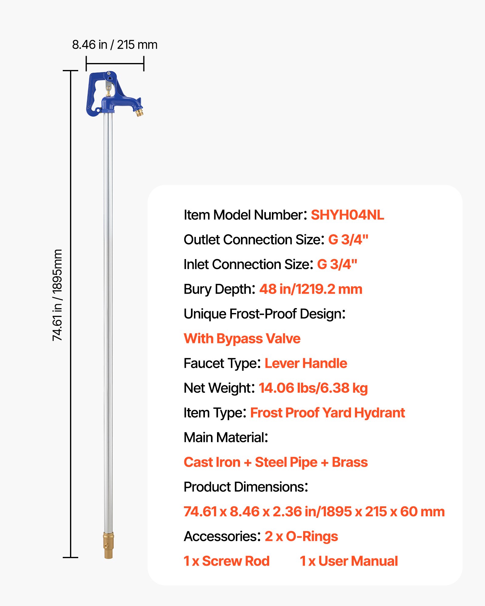 Veličina ulaznog priključka: G 3/4 inča, Neto težina: 14,06 lbs/6,38 kg, Glavni materijal: Lijevano željezo + Čelična cijev + Mesing, Broj modela artikla: SHYH04NL, Vrsta artikla: Dvorišni hidrant otporan na smrzavanje, Jedinstveni dizajn otporan na smrzavanje: S obilaznim ventilom, Vrsta slavine: Ručka, Dimenzije proizvoda: 74,61 x 8,46 x 2,36 inča/1895 x 215 x 60 mm, Veličina izlaznog priključka: G 3/4 inča, Dubina ukopa: 48 inča/1219,2 mm