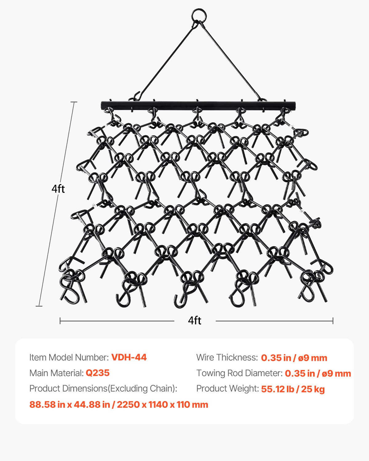 Promjer zuba: 0,35 in / ø9 mm, Težina proizvoda: 55,12 lb / 25 kg, Glavni materijal: Q235, Broj modela artikla: VDH-44, Promjer vučne šipke: 0,35 in / Φ9 mm, Broj zuba: 69, Dimenzije proizvoda: 88,58 in x 44,88 in / 2250 x 1140 mm