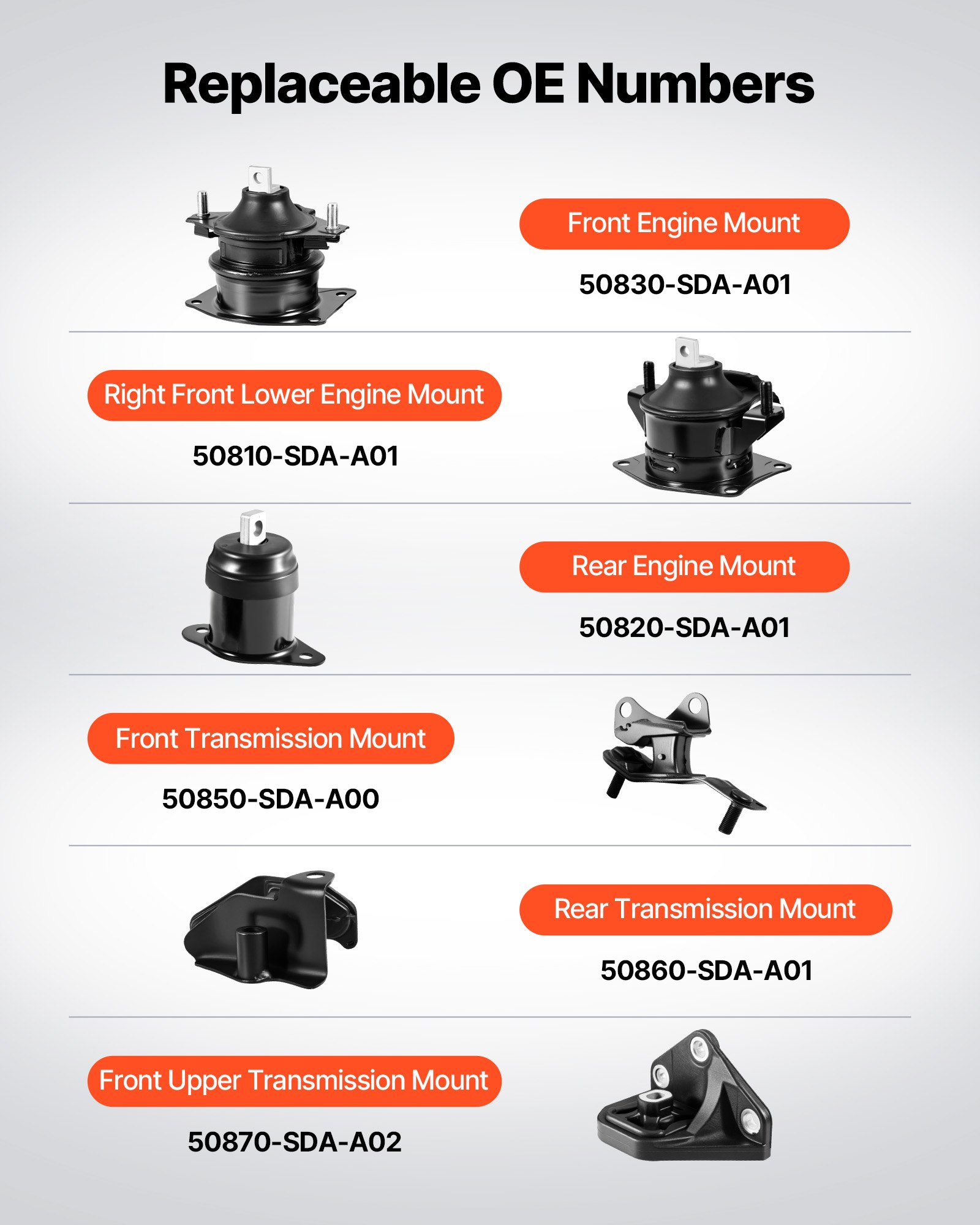Sadržaj kompleta: Prednji, prednji desni donji, stražnji, prednji mjenjač, stražnji mjenjač, prednji gornji nosači mjenjača, Količina: 6 kom, Dimenzije artikla: 7,1 x 5,5 x 6,3 in / 180 x 140 x 160 mm, Neto težina: 12,8 lbs / 5,8 kg, OE broj: A4526HY, A4517, A4516, A4510, A4509, A4542, Broj modela artikla: TZ0088, Materijal: Željezo i aluminij, Kompatibilna vozila: Honda Accord L4 2.4L (2003.-2007.)