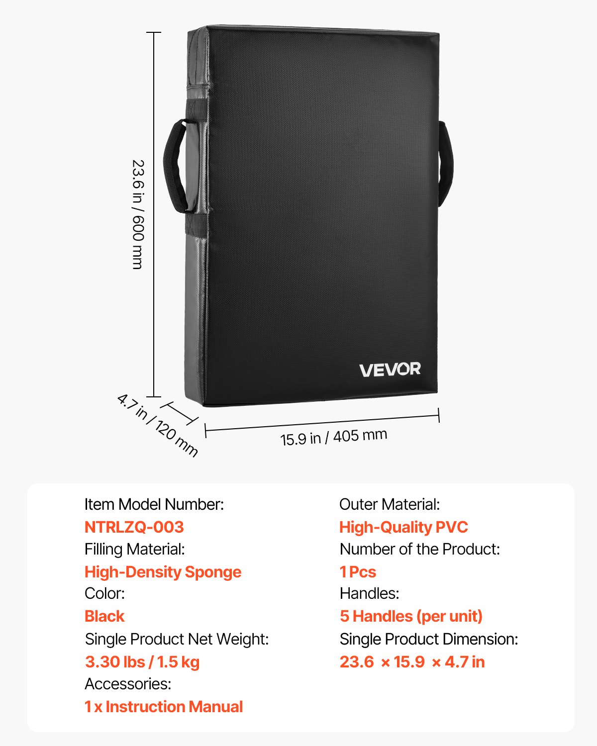 Vanjski materijal: Visokokvalitetni PVC, Neto težina proizvoda: 3,3 lbs / 1,5 kg, Količina: 1 kom., Boja: Crna, Broj modela artikla: NTRLZQ-003, Materijal za punjenje: Spužva visoke gustoće, Dimenzije proizvoda: 23,6 x 15,9 x 4,7 inča / 600 x 405 x 120 mm
