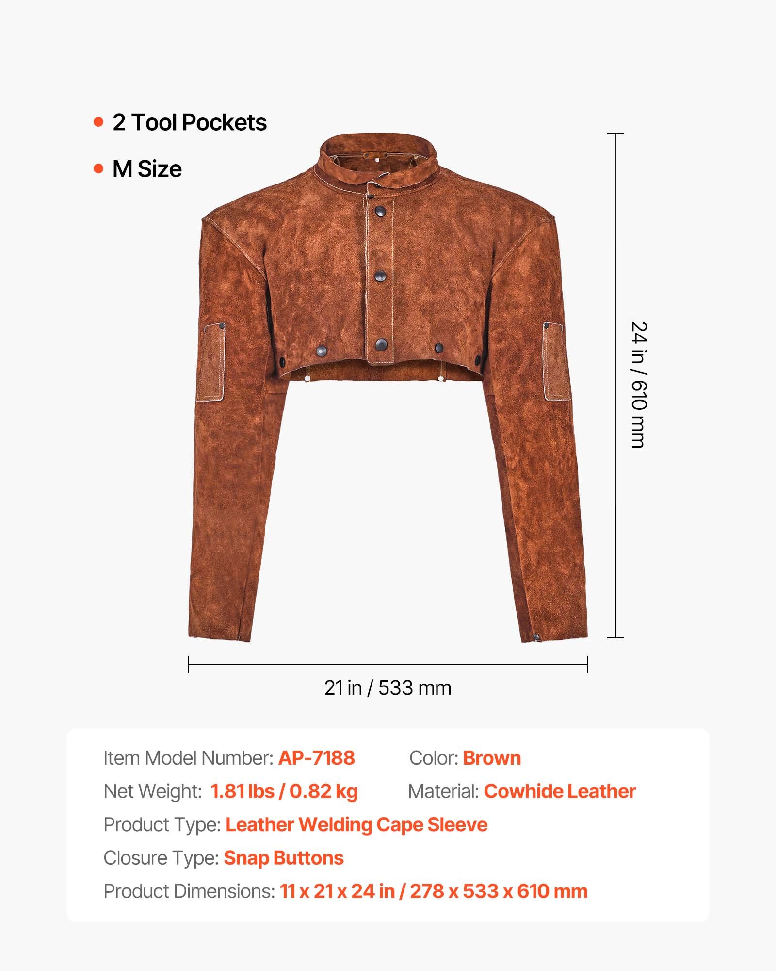 Vrsta proizvoda: Kožni zavarivački plašt, Neto težina: 1,81 lbs / 0,82 kg, Boja: Smeđa, Džepovi za alat: 2, Veličina: M, Broj modela artikla: AP-7188, Materijal: Goveđa koža, Dimenzije proizvoda: 11 x 21 x 24 inča / 278 x 533 x 610 mm