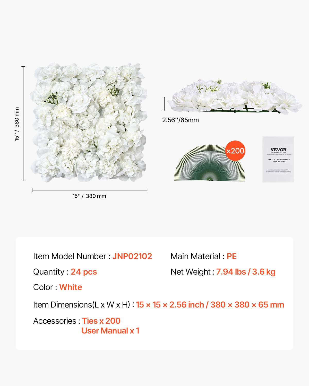 VEVOR Zid od umjetnih biljaka, 24 komada, 380x380x65 mm, Umjetna živica, Besprijekoran dizajn i jednostavna ugradnja za vjenčanje, Valentinovo, dom, proslavu povodom rođenja djeteta, dekoracija pozadine, bijela